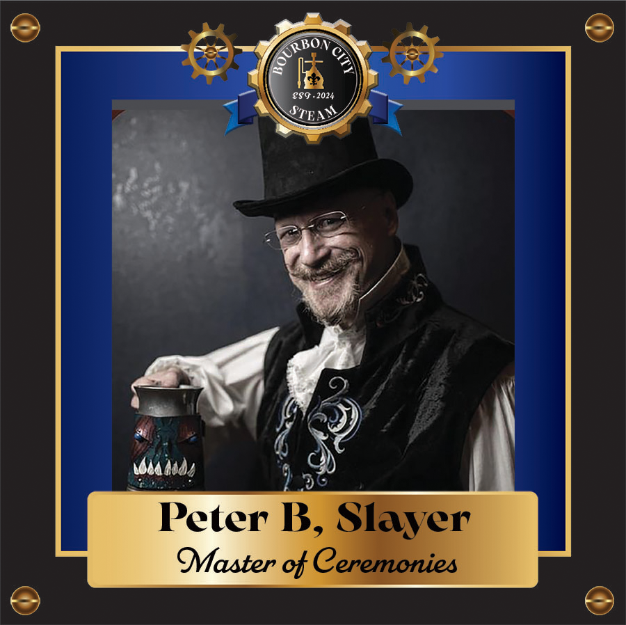 Bourbon City Steam’s Master of Ceremonies Instructor / Entertainer / Master of Ceremony / Host / Auctioneer / Wedding Officiant A dealer in indulgence, a man with a taste for the attainable pleasures of a life well lived, Peter travels the globe learning the secrets to the good life: how to meet and escalate connections with noteworthy people. What he has gleaned, he carries with him to share with new friends and fellow patrons of happiness. Peter B. Slayer is the Steampunk aficionado and leading instructor in Sabrage - the art of opening champagne with a sword. His forthcoming book on the subject is a bubbly tell-all. Don’t miss an opportunity to take a whack at it yourself! This award-winning and often lauded host and his crew rejoice in being a guide to the finer things in life and also delight in sharing cigars, conversation, and good times. Where Peter goes, the good times follow! He invites you to come along. There could be fire eating, candied bacon, airship races, tea dueling, home brewing, bourbon samples, or wedding cake. Anything is possible; laughter is certain.